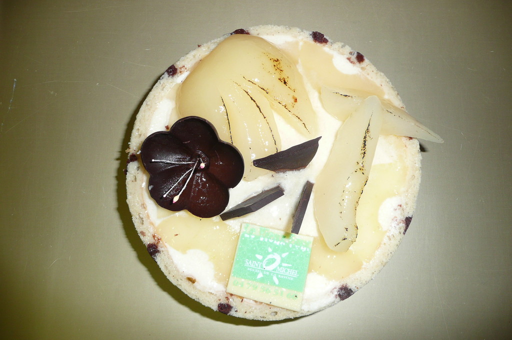Choco-Poires : Biscuit joconde, génoise chocolat, mousse chocolat, mousse poire, morceaux de poires