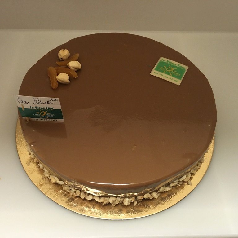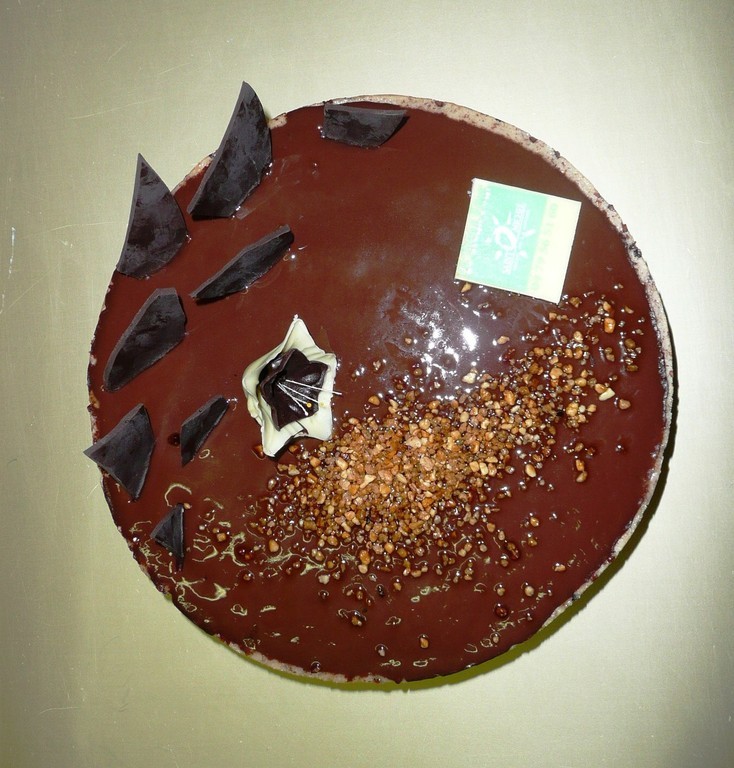 Royal : Biscuit succès, mousse chocolat noir, croustillant praliné, génoise chocolat, glaçage chocolat.