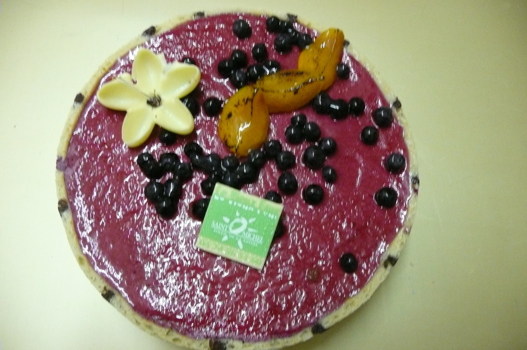 Montagnard : Mousse cassis, génoise nature, mousse abricot, croustillant pistache, biscuit joconde.