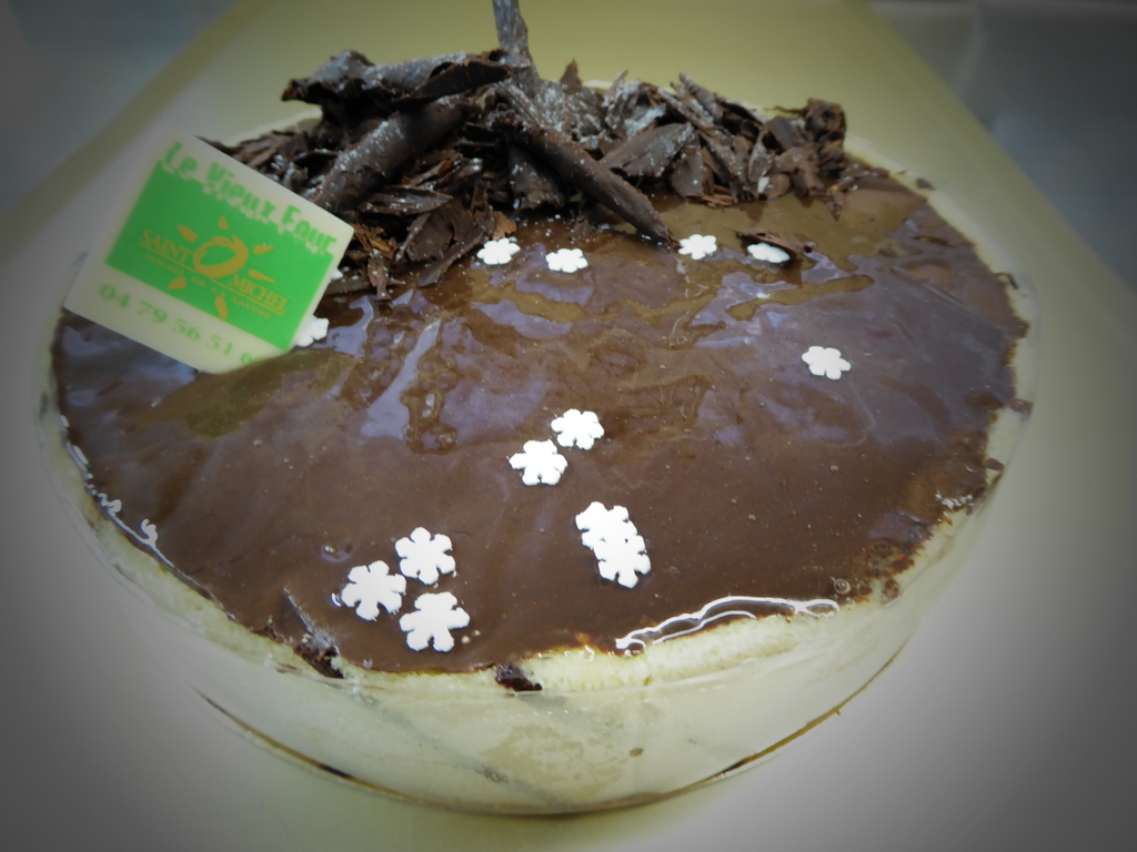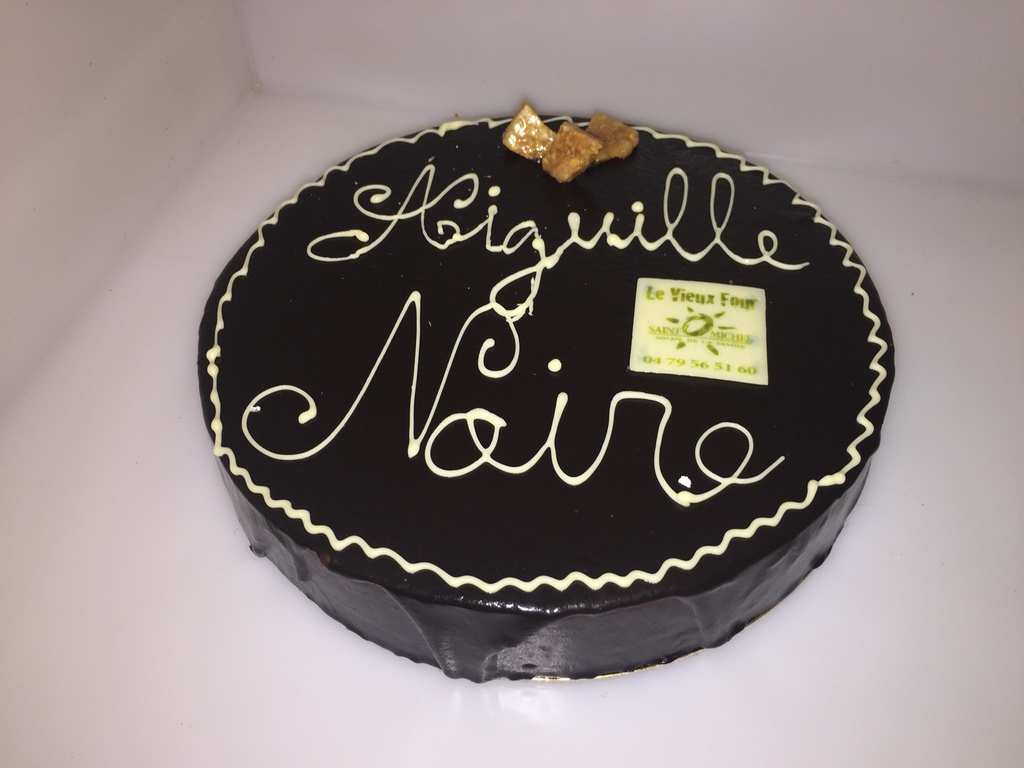 Aiguille Noire : Biscuit sacher chocolat, croquant caramel à la fleur de sel, mousse chocolat noir, ganache chocolat lait et caramel.