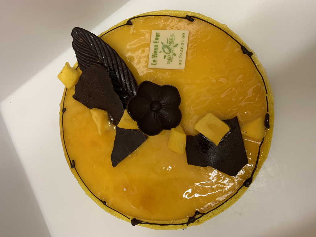 Mangopassion : Compotée de mangue, mousse fruits de la passion et mousse chocolat 64%, biscuit sacher, glaçage mangue.